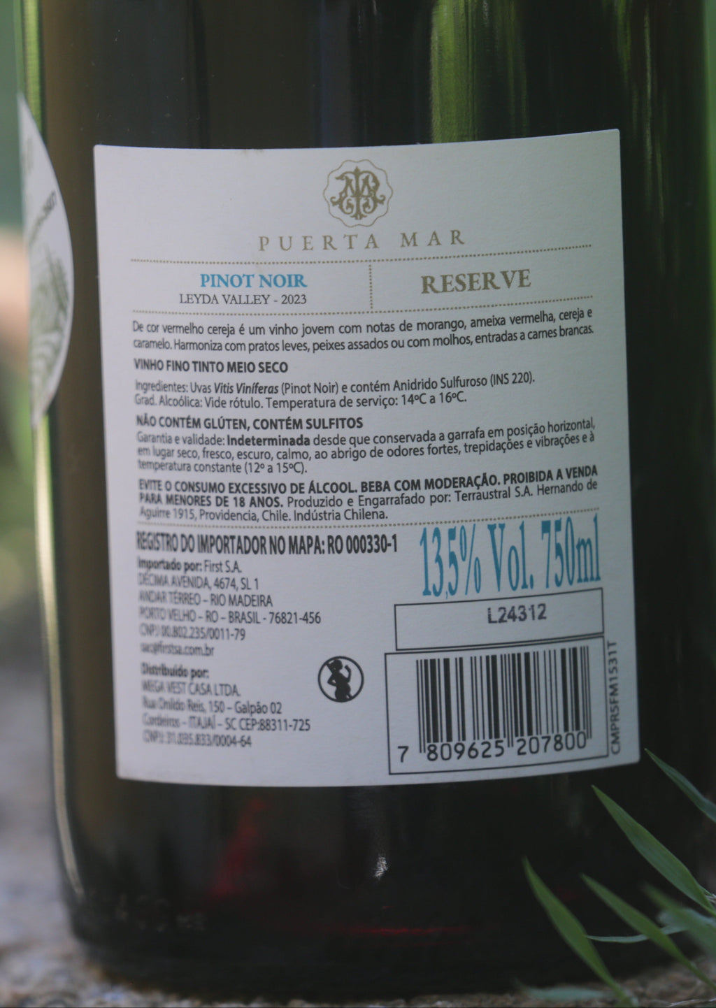 O Puerta Mar Reserva é um tributo à influência marítima. O clima frio do Vale de Leyda permite que a uva Pinot Noir amadureça lentamente, preservando sua acidez vibrante e seus aromas primários. É um vinho jovem, equilibrado e extremamente versátil, que mostra o lado mais elegante da vitivinicultura chilena moderna.